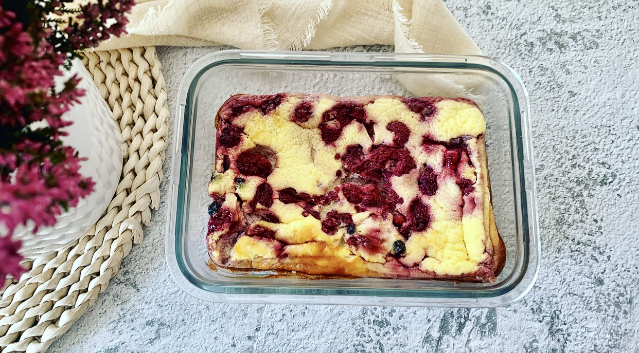 - Na dno formy żaroodpornej o wymiarach 15x20cm przekładamy połowę owoców. Zalewamy przygotowaną masę i na wierzch wykładamy pozostałe owoce. Całość wstawiamy do nagrzanego piekarnika do 160°C na około 40-50minut. Studzimy przy lekko uchylonym piekarniku a następnie zimne ciasto wstawiamy do lodówki na około 2h, aby się zsiadło. Ciasto podczas pieczenia urośnie a później opadnie, gdyż nie ma w sobie proszku do pieczenia. Później pozostaje tylko pokroić i gotowe.