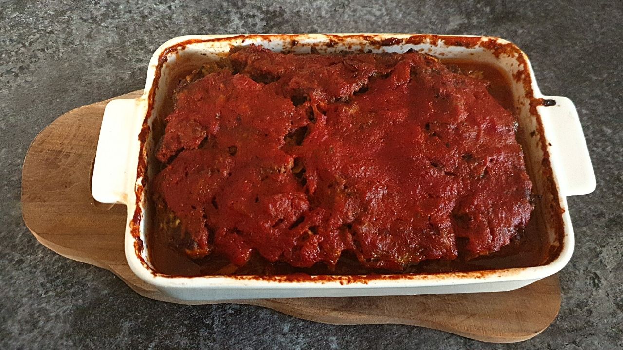 - Foremkę do zapiekania smarujemy masłem. Na dno wykładamy połowę mięsa i wyrównujemy. Na mięso wykładamy odcedzoną kapustę a następnie połowę sosu pomidorowego. Wykładamy kolejno pozostałą część mięsa oraz na górę sos pomidorowy. Wstawiamy do nagrzanego piekarnika do 180°C na 60 minut.
