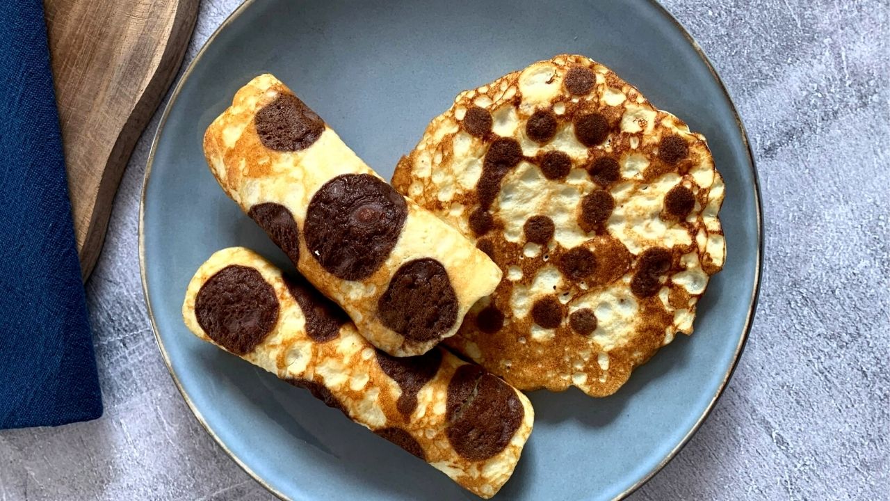 - Na rozgrzaną patelnię wylewaj małe kropeczki z czekoladowego ciasta i podsmaż chwilę. Zalej ciemne kakaowe kuleczki jasnym ciastem i smaż na średniej mocy aż góra placka będzie ścięta. Przewróć na drugą stronę i smaż jeszcze chwilę. Czynność powtórz jeszcze kilka razy.