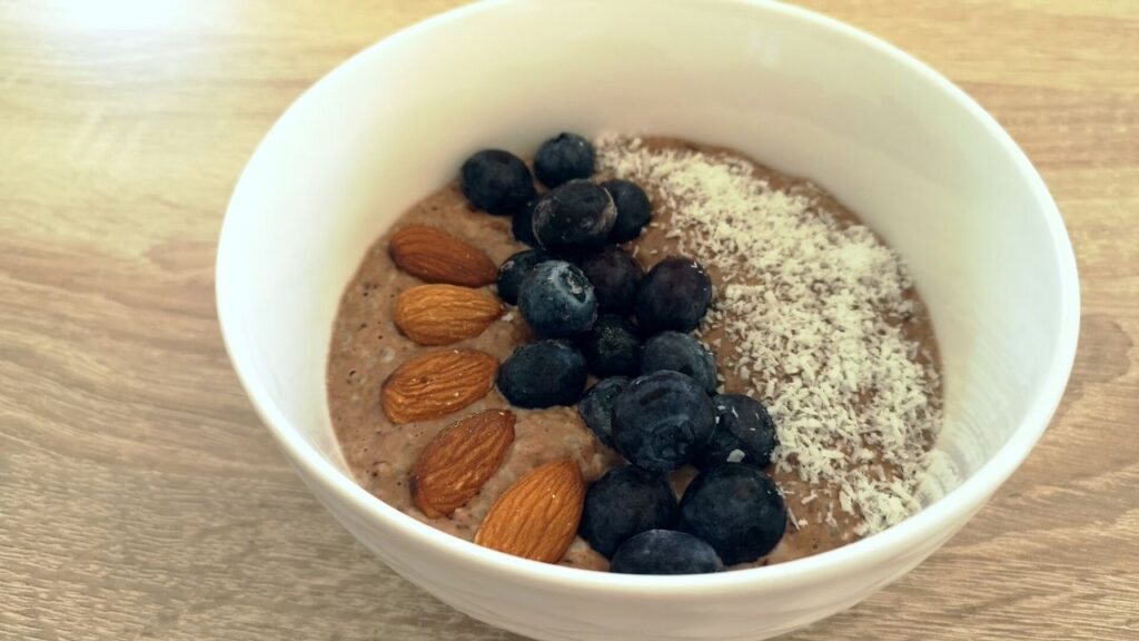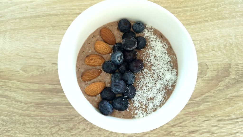 - Przekładam do miseczki. Dekoruję migdałami, borówkami oraz wiórkami kokosowymi. W miarę jak owsianka będzie stygła będzie coraz bardziej gęsta. Gotowe. Smacznego:)