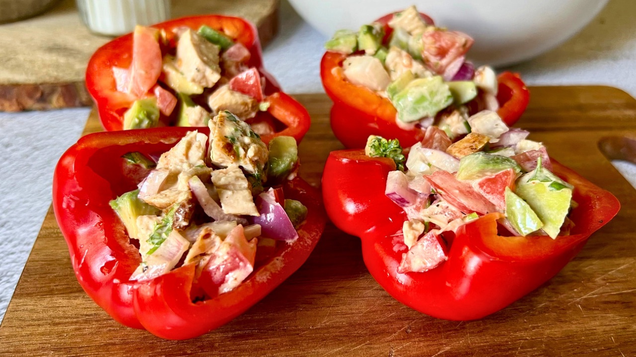 Ja zdecydowałam się na podanie jej w papryce, choć można zjeść ją już samą. Sałatką wypełniany połówki papryki oczyszczone z błonek i nasion. Z podanych składników wyjdą 2 porcje. Gotową sałatkę przechowujemy w lodówce.