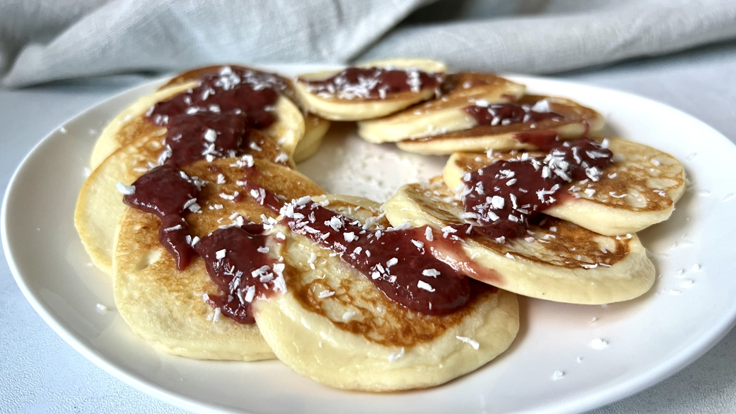Placuszki smażymy na rozgrzanej patelni na oleju kokosowym, można również użyć masła klarowanego. Porcjami wykładamy ciasto i gdy góra lekko się zsiądzie przekładamy na drugą stronę. Gotowe podałam z odrobiną konfitury malinowej i wszystko posypałam jeszcze wiórkami kokosowymi. Przepis można wzbogacić jeszcze np. o kakao. Z podanych składników otrzymamy jedną większą porcję lub dwie mniejsze.