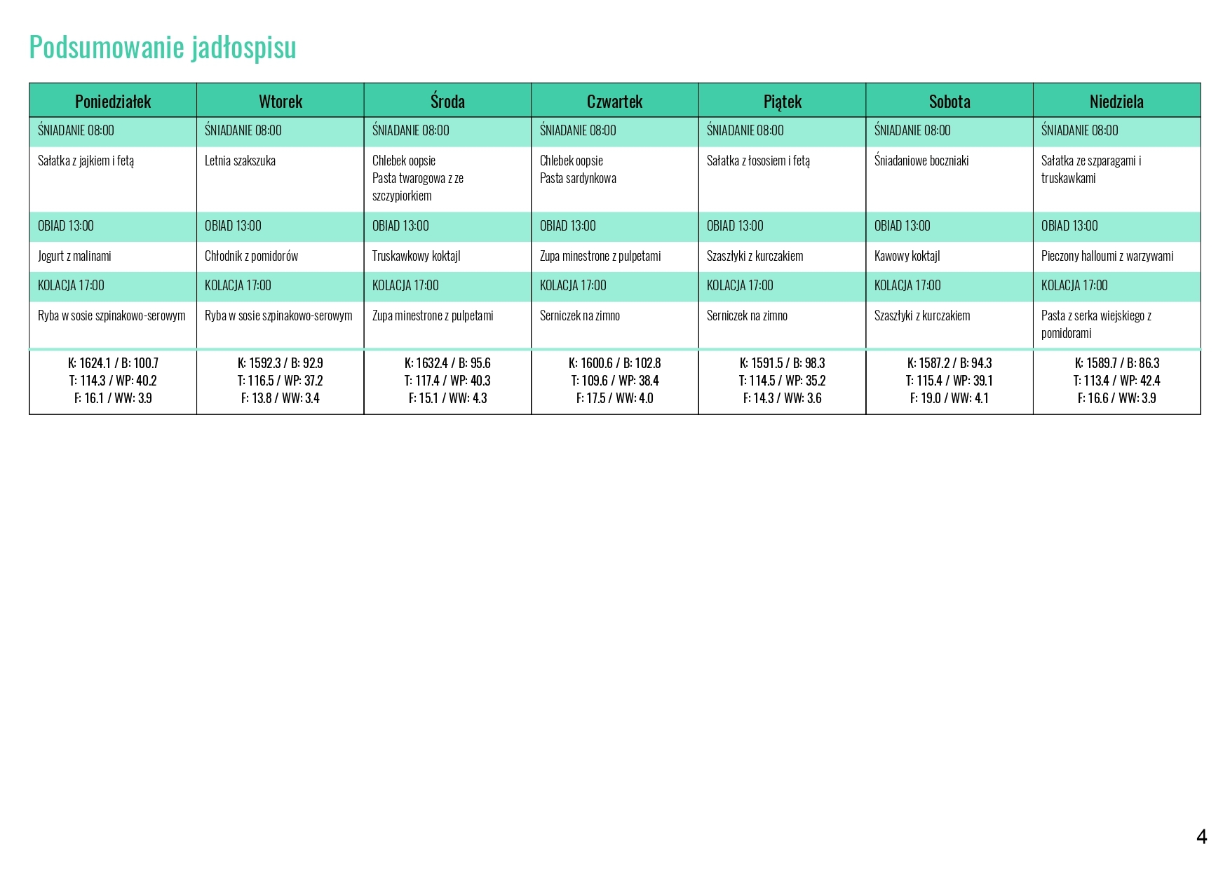 Niektóre dni są połączone, tak aby zaoszczędzić czas i przygotować w jednym czasie posiłki na 2 dni.