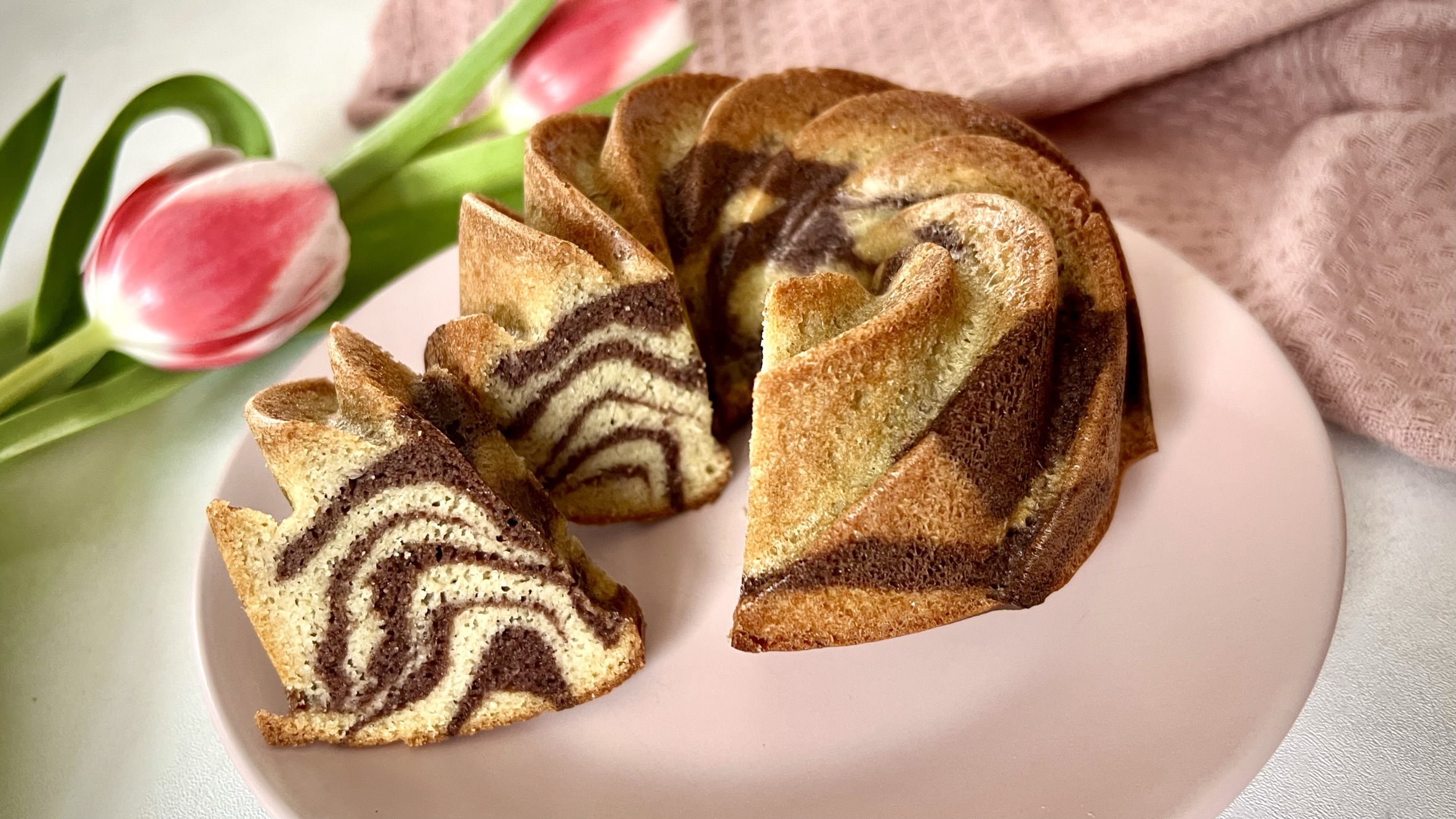 Foremkę do babki o średnicy 16cm smarujemy tłuszczem aby łatwiej było wyjąć później ciasto. Teraz wykładamy po 2-3 łyżki jasnego ciasta, później ciemnego i tak aż skończą się obie masy. Tak przygotowana formę wstawiamy do nagrzanego piekarnika do 170 stopni C na około 25 minut termoobieg. Ciasto studzimy przy lekko uchylonych drzwiczkach piekarnika. Chłodne dekorujemy wg uznania.