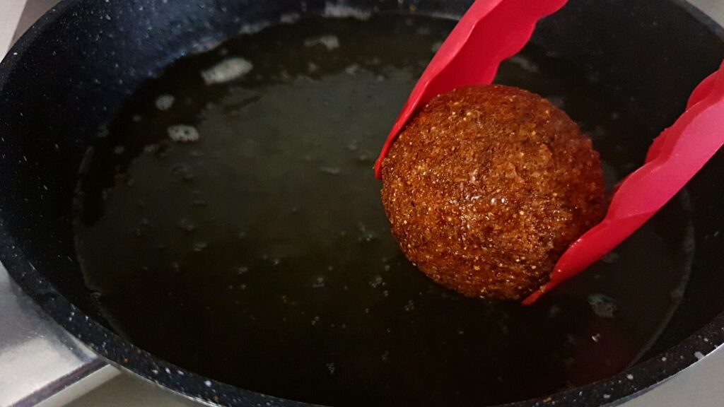 - Smalec rozgrzewamy na patelni. Gdy będzie już bardzo gorący wkładamy przygotowane kulki i smażymy około 8 minut, obracając co chwilę.