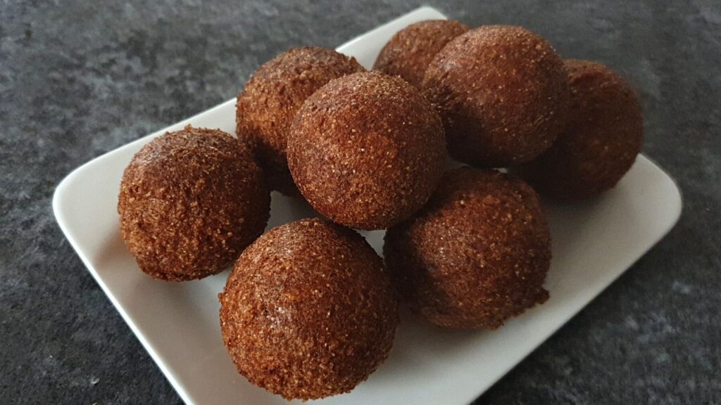 - Wszystkie składniki oprócz smalcu i jednej łyżki erytrolu umieszczamy w jednej misce i mieszamy. Z powstałej masy formujemy 8 kulek.
