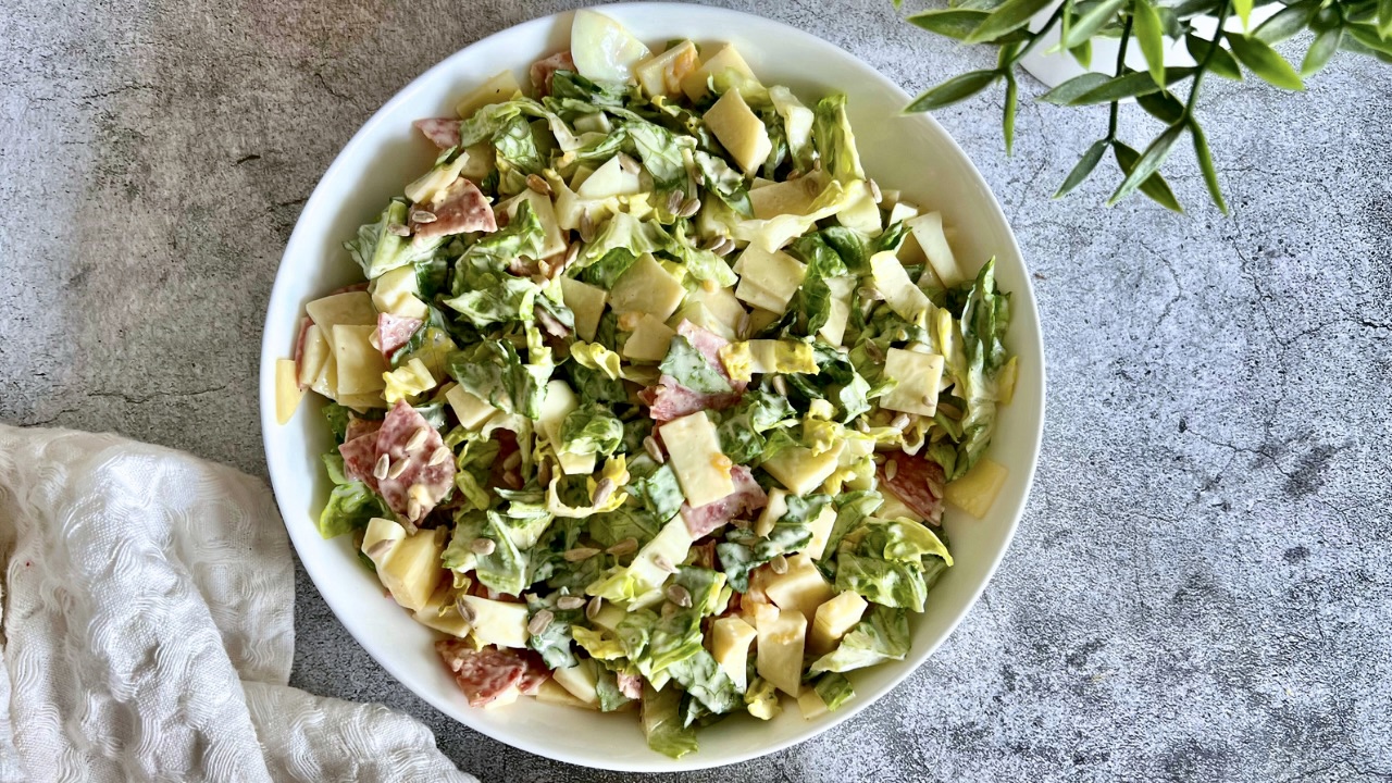 Do jej przygotowania będziemy potrzebować jajka, które gotujemy na twardo, a następnie studzimy. W tym czasie kroimy w paski sałatę lub rozrywamy na kawałki. Kolejne składnik tej sałatki to ser żółty, np. gouda, cheddar. Może być w plastrach lub w jednym kawałku, który następnie kroimy w kostkę. Dalej będziemy potrzebować wędliny. Użyłam salami, ale może być to także szynka czy kabanosy.